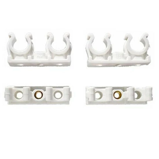 Kunststoff-Rohrbefestigung doppelt, mit Messing-GewindehülseInhalt: 4 Stückfür 15 mm Ø – RohreAusführung: zweifachMaterial: Kunststoffmit Messing-Gewindehülse M6Farbe: weiß