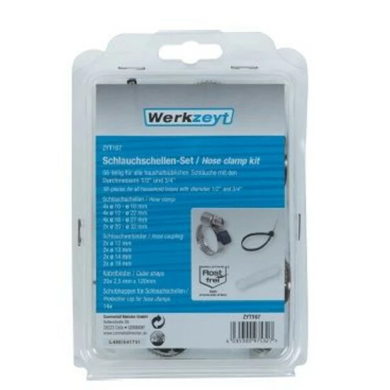 Cornat Schlauchschellen-Set 56-teilig. Für alle haushaltsüblichen Schläuche mit den Durchmessern 1/2 und 3/4, Bestehend aus: 4 Schlauchschellen: ø 10 – ø 16 mm, 4 Schlauchschellen: ø 12 – ø 22 mm, 4 Schlauchschellen: ø 16 – ø 27 mm, 2 Schlauchschellen: ø 20 – ø 32 mm, Je 2 Schlauchverbinder: ø 12 mm, ø 13 mm, ø 14 mm, ø 19 mm, 20 Kabelbinder: 2,5 mm x 120 mm, 14 Schutzkappen f. Schlauchschellen.4 Schlauchschellen: ø 10 – ø 16 mm4 Schlauchschellen: ø 12 – ø 22 mm4 Schlauchschellen: ø 16 – ø 27 mm2 Schlauchschellen: ø 20 – ø 32 mmJe 2 Schlauchverbinder: ø 12 mm, ø 13 mm, ø 14 mm, ø 19 mm20 Kabelbinder: 2,5 mm x 120 mm4 Schutzkappen f. Schlauchschellen